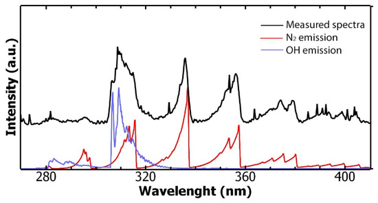 Additionally, equipment characterization included measuring optical emission spectroscopy (OES) using a UV-visible spectrometer (Ocean Optics USB2000, Dunedin, FL, USA) coupled to a UV-Vis optical fiber (Ocean Optics, Dunedin, FL, USA) to identify the electronic transitions in the gaseous species. Spectra recording of the light emission was performed in a line-of-sight parallel to the electrodes (~2 cm below them) along the discharge. Evaluation of the presence of different molecular species was performed by focusing the spectral measurements in the emission range between 200 nm and 800 nm. These results were complemented using the Specair software version 3.0.2.0 (Specair, Rhode-Saint-Genese, Belgium). This software generated a synthetic spectral curve using Boltzmann distributions for electronic, vibrational, and rotational transitions in the plasmas and/or reactive gases.