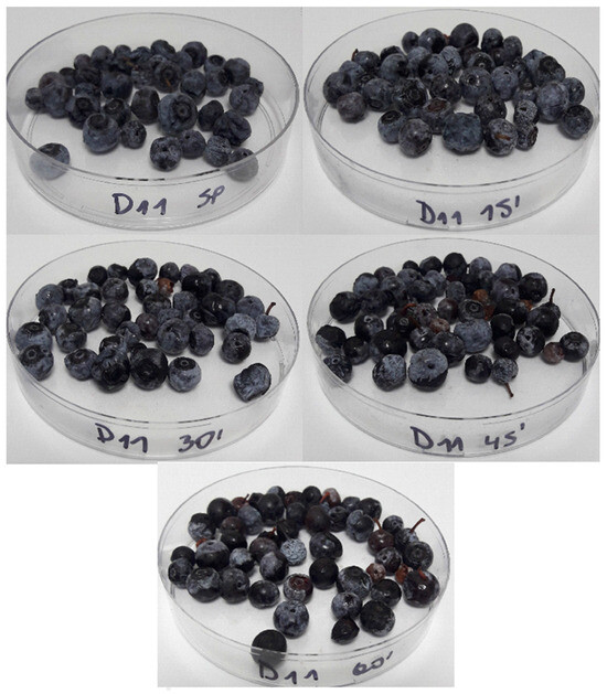 Yeast and mold (Y&M) counts (Table 2) on day 0 showed statistically significant reductions after 30, 45, and 60 s CAP treatments of samples when compared to non-CAP treated samples with an average 2.34 Log CFU g−1 reduction. However, on day 11, only Y&M counts of 30 s CAP treatment were significantly (p < 0.05) lower when compared to non-CAP treated samples with a 1.53 Log CFU g−1 reduction. Fluctuations in Y&M counts observed for 60 s CAP treatment can be attributed to low initial counts on blueberries, thus intensifying the visibility of variations even at a reduced baseline. Table 3 shows aerobic mesophilic bacteria counts, which presented very low native bacterial values (maximum growth of 1.40 ± 0.17 Log UFC g−1) and did not show statistically significant differences when comparing among treatments nor along storage days. Blueberries’ natural low pH values can serve as a hurdle for microbial growth; however, it does not impede yeast and mold growth [35]. Samples used in this experiment were obtained from factories that implement high food safety standards and comply with strict regulatory and commercial microbial quality policies; therefore, low native microbial counts could have interfered with estimating CAP treatment effect on aerobic mesophilic bacteria and Y&M. Pathak et al. [37] observed no statistically significant differences for Y&M when comparing untreated and 5 min treated blueberries after using a diffuse coplanar surface barrier discharge plasma treatment. Furthermore, CAP treatment reduced mesophilic aerobic bacteria largely in comparison to Y&M along a 10-day storage interval [37]. Lacombe et al. [17] used air-generated CAP treatment that achieved a statistically significant reduction in mesophilic aerobic bacterial values, while Y&M did not show significant reduction in blueberries, even for a 120 s CAP treatment duration during a seven-day storage period. Moreover, when comparing DBD-CAP reduction of total aerobic bacteria and Y&M, Dong and Yang [38] observed a weaker antimicrobial effect on Y&M that the authors linked to cell wall thickness and complexity of these microorganisms. Ji et al. [39] used DBD-CAP to treat blueberries and observed a significant decrease of 1.16 Log CFU g−1 Y&M after 90 s treatment, while for mesophilic aerobic bacteria a significant reduction of 0.88 Log CFU g−1 was obtained after the same treatment time. Mesophilic aerobic bacteria initial counts of blueberries in the latter study were 2.31 Log CFU g−1, which is higher than what was observed in our study [39]. However, Y&M CAP reduction values are comparable with our findings [39]. No visible microbial decay was observed in samples by day 11 (Figure 6), which correlates with low Y&M and aerobic mesophilic bacteria counts.