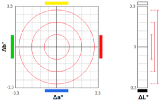 Crumb color was measured on two central slices with a colorimeter (model CLM-196 Benchtop, Eoptis, Trento, Italy) expressing the measurement following the CIE L*a*b* color system, where the color is defined in relation to the chromatic coordinates brightness (L*), red-green range (a*), and blue-yellow range (b*). The Chroma (C*) and tint (H*) values are expressed by the following equations: