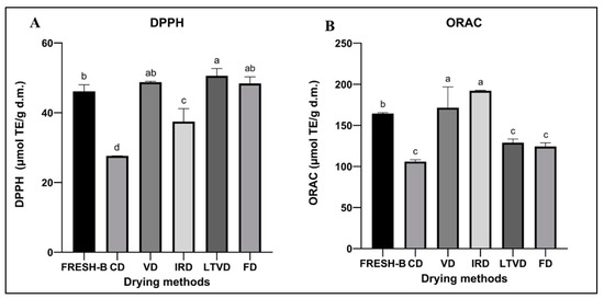 Antioxidant activity for samples extracts from fresh-blanched and dehydrated red cabbage. FRESH-B: fresh-blanched; VD: vacuum drying; CD: convective drying; IRD: infrared drying; LTVD: low-temperature vacuum drying; FD: freeze drying. Values are expressed as mean ± standard deviation. (A) is DPPH assay and (B) is ORAC assay. Different letters indicate significant differences (p < 0.05).