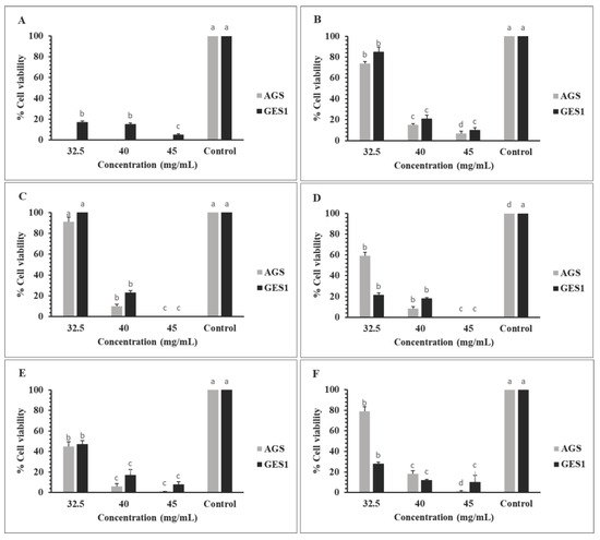 Antiproliferative activity of fresh-b and dehydrated red cabbage extracts (mg/mL) on gastric cancer cells. (A) Fresh-blanched, (B) CD: convective drying, (C) IRD: infrared draying, (D) VD: vacuum drying, (E) LTVD: low-temperature vacuum drying and (F) FD: freeze drying. Control: without red cabbage extract. The statistical analysis of AGS and GES1 was evaluated separately. Different letters indicate significant differences (p < 0.05).