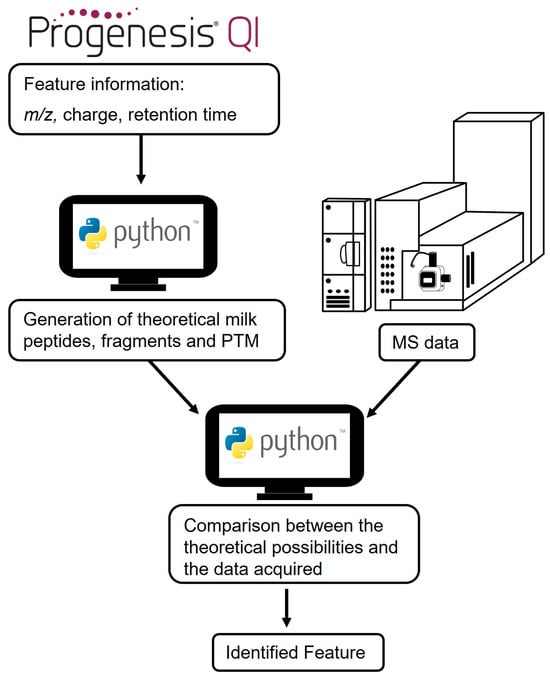 To identify the acquired mass spectrometric data using computational data analysis, the dataset had to be converted into a compatible data format. The datasets were converted from the device-specific uep-files to mzML-files with MSConvert (ProteoWizard, Version 3.0.20340). The feature identification algorithm was developed in Python (Version 3.9.16) and was divided into two parts. The first part is a filter for the theoretical possible tryptic peptides based on the m/z and the charge. Therefore, the protein sequences of the different milk proteins were obtained as fasta-files from uniprot.org (accessed 15 August 2023). The following milk proteins were considered: α-lactalbumin, β-lactoglobulin, BSA, α-s1-casein, α-s2-casein, β-casein, and κ-casein. The information on the features was obtained from the software Progenesis QI 2.3 (Nonlinear Dynamics Ltd., Newcastle upon Tyne, UK). The filter also considers modifications of the tryptic peptides as mass shifts. In the second part of the algorithm, a comparison between the theoretically possible tryptic peptides and the acquired mass spectrometric data takes place, which leads to the identified molecule. The schematic workflow is presented in Figure 1.