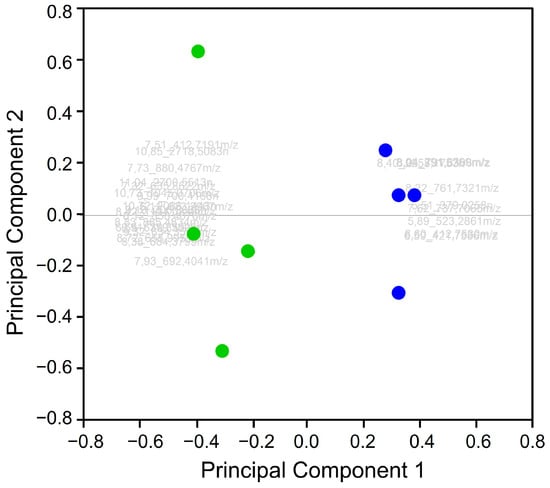 The two-dimensional principal component analysis of the milk samples. PCA scores plot in combination with the loadings of PC1 and PC2 of the direct enzymatic degraded milk samples: heated (green) and non-heated (blue) milk. The samples of these two groups are sample preparation replicates. PC1 and PC2 show 92.24% of the variance using 28 features. The assignment of the feature designation of the graphic is broken down in Table S8.