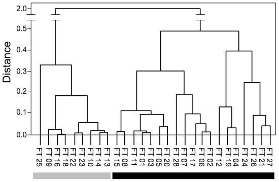 HCA dendrogram of the 28 significant features. The features marked in grey presented decreasing signal intensity due to the heat treatment. The features marked in black increased in signal intensity after heat treatment.