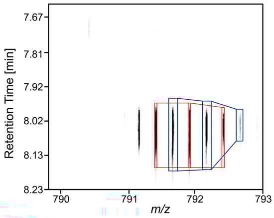 Ion map of feature FT 16 (m/z 791.6306) and FT 18 (m/z 791.3799). The ions marked in red are the three isotopes associated with feature FT 18 (m/z 791.3799), and the ions marked in blue are the isotopes that were assigned to FT 16 (m/z 791.6306). By observation of all the ions in the figure, it is visible that the ions have the same m/z distance from each other.