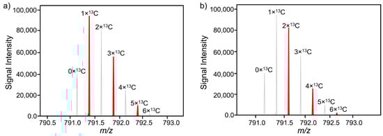 Ion spectra of feature FT 16 (m/z 791.6306) and FT 18 (m/z 791.3799). Feature FT 18 is shown in (a). The signals marked in red are the isotopes assigned by the software to FT 18. In (b), the red-marked peaks are associated with FT 16. The combination of both spectra shows that the signals labeled in red are 13C isotopes of the same molecule.