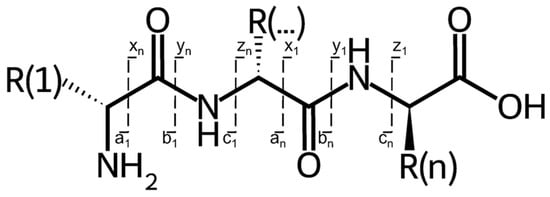 Furthermore, the features that were identified were mainly y-fragments and double-charged tryptic peptides. The y-fragments were, as according to Steen et al. [,] the predominant fragments when a quadrupole or a quadrupole-TOF was used as a mass analyzer. Figure 6 shows the generic structure of a peptide and the possible fragmentation types. The mentioned y-fragments were molecules that are formed when the nomenclature starts from the C-terminal backbone of the peptide.
