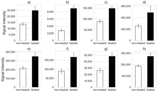 In addition, the following double-charged features with the m/z 634.3570 (α-s1-casein), 623.2967 (β-lactoglobulin), and 880.4767 (α-s1-casein) were also identified (Table 2). A comparison of the signal intensities of the individual eight features showed that each one had a significantly higher signal intensity after heating than in the unheated state. Figure 7 shows the mean value of the signal intensities out of the low-energy spectrum. These eight features can also be compared with the results of the model approach (milk protein standards).