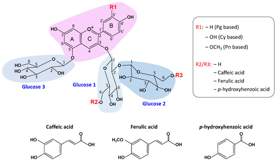 Figure 1. Structure of anthocyanins from purple sweetpotato. The pink shade indicates the anthocyanidin structure, the blue shade shows glycosylation by three glucose molecules, and the R2 and R3 are the positions for acylation. Modified from [6,8].