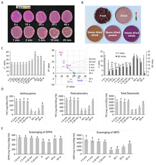 Figure 2. Effects of pre-treatments on the anthocyanin-related properties for purple sweetpotato. (A) the color change from 0 s–20 min for newly cut sweetpotato slices; (B) the powder color; and the (C) CIEL*a*b* parameters, (D) contents of anthocyanins, total phenolics, and total flavonoids, and (E) antioxidant activities by scavenging of DPPH and ABTS of fresh slices and powder from four pre-treatments. From (CE), F is for Fresh, D is for Dried, and SD is for Steamed and Dried with varied pre-treatments. ΔE were between “F 0 s” and other samples. The universal pH indicator paper was shown as color reference. All values are based on three biological repeats. The difference significances were done by one-way ANOVA and Duncan’s test at p < 0.05, and the uppercase letters are used to show differences for C, while lowercase letters are used for ΔE and other indices.