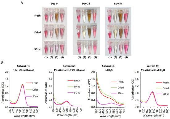 The pH for initial extracts by the four solvents were around 0, 3.9, 6.0, and 2.4, respectively (Table 1). For the diluted solutions with theoretically identical PSPA concentration (Figure 3), magenta color and λmax around 526 nm were shown for solvent (1), (2), and (4), and the colors were light for solvent (2). The solutions of solvent (3) were brown for “Fresh” and “Dried” samples with no absorption peak identified, while they were pink for “SD-w” samples with λmax at 554 nm. No noticeable color decay was observed for solutions of solvent (1), (3), and (4) after 54 days’ storage. While for extracts from solvent (2), the light magenta color faded away completely by Day 25.
