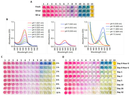 For freshly prepared PSPA solutions, the color (Figure 4A) and spectra (Figure 4B) were shown. From pH 1 to 7, the color gradually faded from magenta to pink, corresponding to decreased peak values and a gradual bathochromic shift of λmax from 521 nm to 545 nm (Table 2). The discontinuous color and spectra for pH 7, 8, and 9 were caused by the buffer systems, with pH 1.0 to 7.0 as citrate-phosphate buffers, pH 8.0 as a phosphate buffer, and pH 9.0 to 13.0 as glycine-NaOH buffers. Increasing pH from 9 to 13 resulted in a color change from pink to blue/green and then yellow, indicating an alternation in anthocyanin structure from the red flavylium cation to the blue/green quinonoid base and then yellow chalcones as reported [11,13].