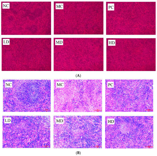 Section of spleen tissue (hematoxylin and eosin staining, n = 10): (A) (100×); (B) (200×).