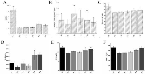 (A) Ability to produce serum hemolysin; (B) delayed-type hypersensitivity; (C) carbon clearance phagocytic index; serum levels of immune factor (D) IL-2, (E) IL-6, (F) TNF-α in mice. The values are presented as mean ± SD, n = 10. Compared to NC group, * indicates a significant difference (p < 0.05), and ** indicates a highly significant difference (p < 0.01).