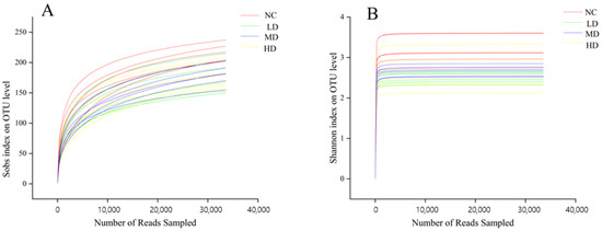 (A) Sobs index dilution curve; (B) Shannon index dilution curve. n = 6.