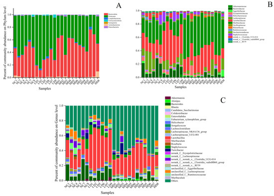 To further investigate the microbial community composition and species richness of the four groups of samples, the species richness of each group of samples was calculated at the phylum, family, and genus levels and plotted as a histogram, as shown in Figure 6. From Figure 6A, it can be seen that at the phylum classification level, the intestinal flora of mice consisted mainly of Bacteroidetes (Phylum Bacteroidetes) and Firmicutes (Phylum Thick-walled Bacteria), which accounted for more than 90% of the total flora. The LD group of health drinks had an increase in Firmicutes compared with the NC group, and the number of Bacteroidetes decreased compared with the NC group. The abundance of Firmicutes in the MD group decreased compared with that in the NC group, corresponding to an increase in Bacteroidetes. The HD group showed a similar trend to the MD group. Studies have shown that there is a correlation between the number of Firmicutes in the gut and the body’s obesity status, with an increase in the body’s diet and an increase in body fat content causing a subsequent increase in the number of Firmicutes, which is why Firmicutes are called “Fat Fungus” [22]. Ley first showed that obesity was associated with intestinal flora and that obese mice had more Firmicutes than lean mice [23]. At the same time, Million disputed this view, arguing that it was mostly gut microbes at the species level that correlate more strongly with obesity status in humans [24]. There are several hypotheses as to the specific mechanisms by which gut flora contribute to obesity, but there are no definitive findings. In short, changes in gut flora are involved in the development of obesity. The differences between the remaining phylum groups were small and not discussed.