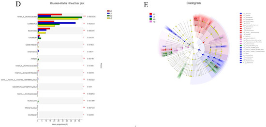 The relative abundances of the major bacteria at (A) phylum level, (B) family level, (C) genus level based 16S rRNA sequences. (D) Multispecies difference test bar chart; (E) LDA discriminant tree. n = 6. One-way ANOVA was chosen to compare statistical differences between groups. Compared to NC group, * indicates a significant difference (p < 0.05), and ** indicates a highly significant difference (p < 0.01), *** indicates a highly significant difference (p < 0.001).