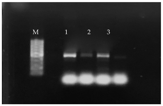 Results of the PCR analysis of some broth culture enrichment samples of commercial chicken thighs and breasts. Legend: M: 100 bp Plus DNA Ladder; 1 and 2: chicken thigh samples; 3: chicken breast sample.