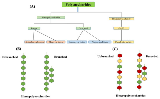 Classification of polysaccharides (A), homopolysaccharides (B), and heteropolysaccharides (C) of different types of natural polysaccharides. Note: GAGS means Glycosaminoglycan.