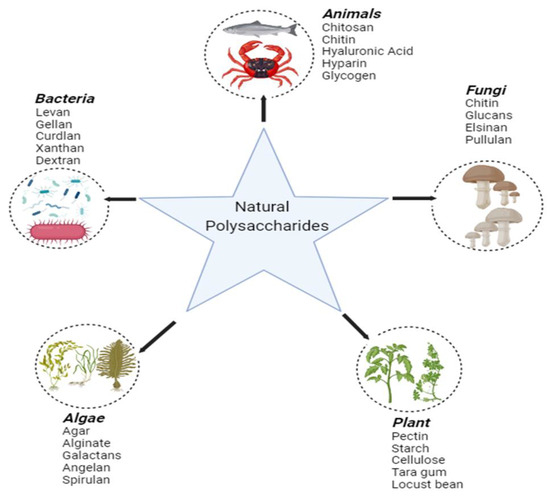 Polysaccharides of natural origin can be derived from diversified sources (Figure 2), such as algae (e.g., alginate), plants (e.g., pectin, gums), microbes (e.g., dextran), and animals (e.g., chitosan) [33,34], and can be regarded as crucial functional substances that perform significant functions in several physiological and biological processes, such as antioxidant, anticancer, anti-hyperglycemic, and immunological regulatory activities [35,36]. The utilization of microbial polysaccharides in biotechnology and biological sciences began several years ago [35,36].