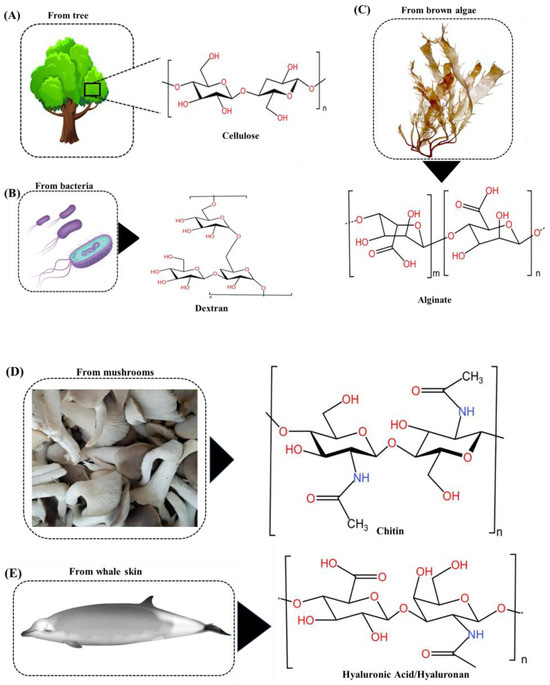 Cellulose from trees with its structure (A), dextran from bacteria with its structure (B), alginate from brown algae with its structure (C), chitin from mushrooms with its structure (D), and hyaluronic acid/hyaluronan from whale skin with its structure (E).