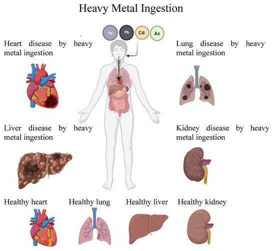 Common heavy metals, such as cadmium, lead, mercury, and arsenic, are frequently present in both the environment and food. Even at smaller doses, they are known to endanger health but are deadly in greater quantities. Heavy metal toxicity can reduce energy levels and affect the functioning of the brain, lungs, kidneys, liver, blood composition, and other critical organs (Figure 4). Continuing exposure can lead to gradual advancement of physical, muscular, and neurological degenerative processes that parallel diseases such as multiple sclerosis, Parkinson’s disease, Alzheimer’s disease, and muscular dystrophy. Frequent long-term exposure to certain metals and their compounds will cause cancer [121].