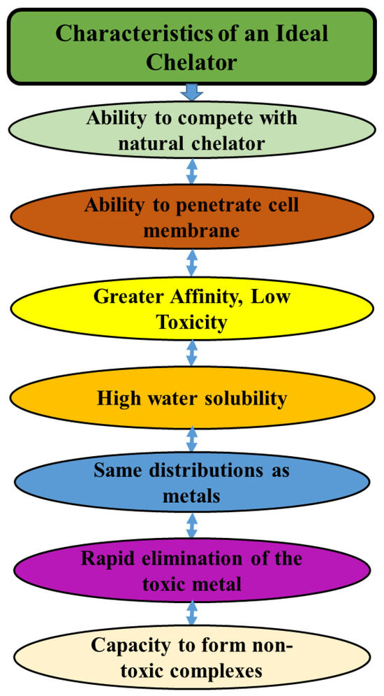 An efficient chelator should possess excellent water solubility, resistance to biotransformation, and the capacity to access metal storage sites; it should also maintain chelating efficacy at the pH of bodily fluids and exhibit the ability to build metal complexes that are less hazardous than unbound metal ions (Figure 5).