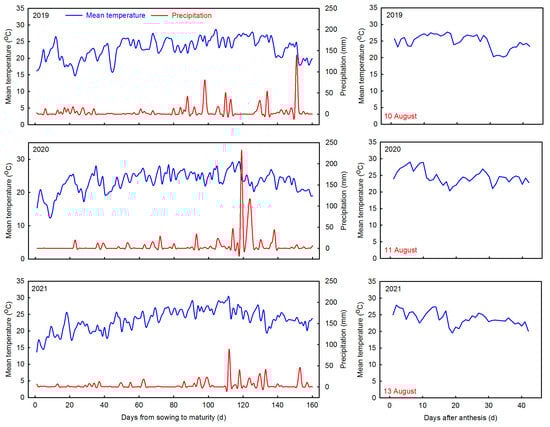 Daily mean temperature and precipitation during the growth period of rice, 2019–2021.