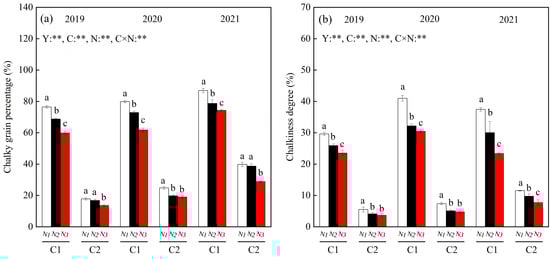 Year, variety, N fertilizer dosage, and their interactions significantly affected the chalky grain percentage and chalkiness (Figure 2). The chalky grain percentage and chalkiness were significantly higher in the chalkier variety C1 than in the low-chalky variety C2. The chalky grain percentage and chalkiness of both varieties decreased with increasing N fertilization. After 3-year averaging, the chalky grain percentage and chalkiness were reduced by 8.93–19.33% and 16.84–28.02% in C1 and by 8.61–25.49% and 22.41–33.99% in C2 under the N2 and N3 treatments, respectively, compared to the N1 treatment (Figure 2a,b).