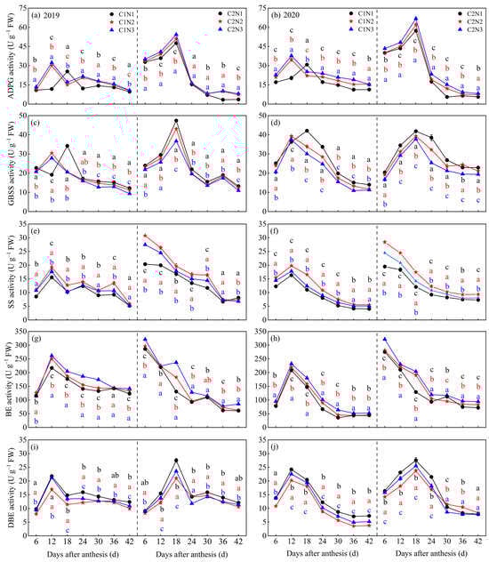 Dynamic changes in the activities of grain ADPG (a,b), GBSS (c,d), SS (e,f), BE (g,h), and DBE (i,j) in different chalky hybrid indica rice under different N application rates. Different colored lowercase letters correspond to statistical differences at the 0.05 level for each N application rates in the same year, period and variety. Vertical bars represent mean ± standard deviation (n = 3). ADPG, adenosine diphosphate glucose pyrophosphorylase; GBSS, granule-bound starch synthase; SS, soluble starch synthase; BE, starch branching enzyme; and DBE, starch-debranching enzyme. C1, Chuannongyou 508; C2, Shuangyou 573. N1, N2, and N3 denote 75, 150, and 225 kg/hm2 of applied N application rates, respectively.
