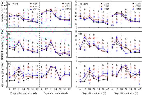 Dynamic changes in the activities of grain GDH (a,b), GOGAT (c,d), and GS (e,f) in different chalky hybrid indica rice under different N application rates. Different colored lowercase letters correspond to statistical differences at the 0.05 level for each N application rates in the same year, period and variety. Vertical bars represent mean ± standard deviation (n = 3). GDH, glutamate dehydrogenase; GOGAT, glutamate synthetase; and GS, glutamine synthetase. C1, Chuannongyou 508; C2, Shuangyou 573. N1, N2, and N3 denote 75, 150, and 225 kg/hm2 of applied N application rates, respectively.