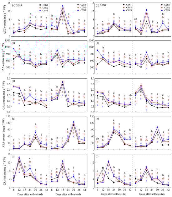 Dynamic changes of endogenous hormones ACC (a,b), IAA (c,d), GAs (e,f), ABA (g,h), and ZRs (i,j) in grains of different chalky hybrid indica rice under different N application rates. Different colored lower case letters correspond to statistical differences at the 0.05 level for each N application rates in the same year, period and variety. Vertical bars represent mean ± standard deviation (n = 3). ACC, 1-aminocyclopropane 1-carboxylic acid; ABA, abscisic acid; IAA, indoleacetic acid; GAs, gibberellins; and ZRs, cytokinins. C1, Chuannongyou 508; C2, Shuangyou 573. N1, N2 and N3 denote 75, 150, and 225 kg/hm2 of applied N application rates, respectively.
