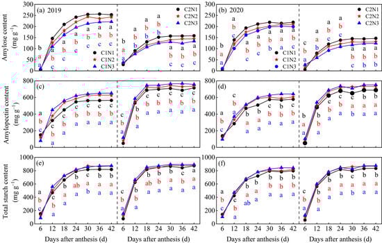 The dosage of N fertilizer significantly affected the synthesis of starch and its components in the grains of the different rice varieties (Figure 6). Overall, both varieties synthesized and accumulated more starch in 2019 than in 2020, and the C2 kernels exhibited weaker amylose synthesis than the C1 kernels, whereas the opposite was true for amylopectin and total starch. With an increasing post-anthesis time, the accumulation of amylose, amylopectin, and total starch in the grains of both varieties gradually increased and eventually remained stable. Notably, amylose accumulated more slowly, and amylopectin accumulated more rapidly in C2 than in C1 6–12 days after anthesis to promote the rapid accumulation of total starch and reach equilibrium earlier (18 days after anthesis). In both varieties, amylose content showed the order of N1 > N2 > N3 for (Figure 6a,b), which was N1 < N2 < N3 for amylopectin and total starch content (Figure 6c–f).
