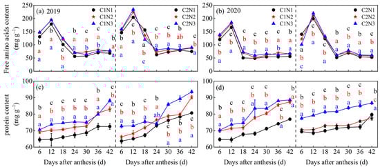 Dynamic changes in free amino acids (a,b) and total protein (c,d) in grains of different chalky hybrid indica rice under different N application rates. Different colored lowercase letters correspond to statistical differences at the 0.05 level for each N application rates in the same year, period and variety. Vertical bars represent mean ± standard deviation (n = 3). C1, Chuannongyou 508. C2, Shuangyou 573. N1, N2, and N3 denote 75, 150, and 225 kg/hm2 of applied N application rates, respectively.