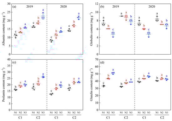 Effect of N application rates on rice albumin (a), globulin (b), prolamin (c), and glutelin (d) of different chalky hybrid indica rice. Different colored lowercase letters correspond to statistical differences at the 0.05 level for each N application rates in the same year, period and variety. C1, Chuannongyou 508. C2, Shuangyou 573. N1, N2, and N3 denote 75, 150, and 225 kg/hm2 of applied N application rates, respectively.