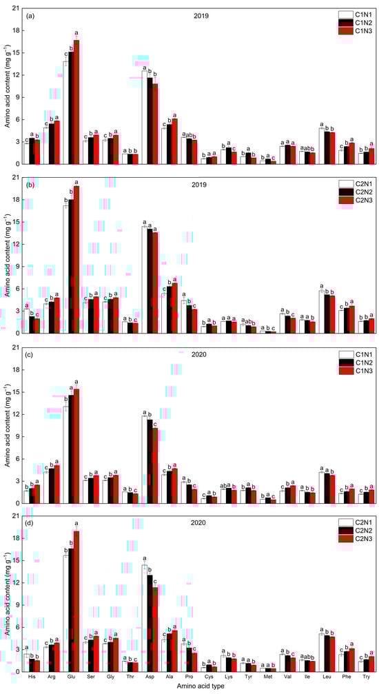 The total amino acid content was significantly higher in the C2 than in the C1 rice and higher in 2019 than in 2020 (Figure 9); the overall performance trend of the amino acid composition was generally similar between years and varieties. In both varieties, Glu, Asp, and Leu accounted for a higher proportion of each amino acid composition type, followed by the rest of the compositions; Among them, the sum of Glu, Asp, and Leu in the C1 and C2 rice accounted for 43.83–48.02% and 47.7–49.94% of the total amino acids under N application, respectively. Also, higher percentages of α-ketoglutarate- and 3-phosphoglycerate-derived amino acids such as Glu, Arg, Ser, Gly, Ala, and Cys were found in the C2 rice compared to C1. The contents of Thr, Asp, Pro, Ile, and Leu in the C1 whole rice decreased with an increasing N dosage, and the contents of Lys, Tyr, and Met increased and then decreased, whereas the remaining amino acids showed an increasing trend. In addition, His, Thr, Asp, Pro, Lys, Tyr, Met, Val, Ile, and Leu in the C2 whole rice decreased with an increase in N fertilizer dosage, whereas the Cys content first increased and then decreased, and the remaining amino acids tended to increase (Figure 9a–d), indicating that an increased N fertilization reduced the synthesis of pyruvate- and oxaloacetate-derived amino acids (Asp, Thr, Lys, Val, Leu, and Ile, etc.), but promoted the accumulation of α-ketoglutarate- and 3-phosphoglycerate-derived types of amino acids (Glu, Arg, Ser, Gly, and Cys, etc.).