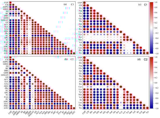 Relationship between rice chalkiness and key enzyme activities of grain C and N metabolism, endogenous hormones (a,b) and amino acid composition (c,d). C1, Chuannongyou 508. C2, Shuangyou 573. CGP, chalky grain percentage; CD, chalkiness degree; ADPG, adenosine diphosphate glucose pyrophosphorylase; GBSS, granule-bound starch synthase; SS, soluble starch synthase; BE, starch branching enzyme; DBE, starch-debranching enzyme; GDH, glutamate dehydrogenase; GOGAT, glutamate synthetase; GS, glutamine synthetase; ACC, 1-aminocyclopropane 1-carboxylic acid; ABA, abscisic acid; IAA, indoleacetic acid; GAs, gibberellins; ZRs, cytokinins; AC, amylose; APC, amylopectin; TC, total starch; FAA, free amino acid; PC, protein; AMC, albumin; GLC, globulin; PMC, prolamin; GTC, glutelin; His, histidine; Arg, arginine; Glu, glutamic acid; Ser, serine; Gly, glycine; Thr, threonine; Asp, aspartic acid; Ala, alanine; Pro, proline; Cys, cysteine; Lys, lysine; Tyr, tyrosine; Met, methionine; Val, valine; Ile, isoleucine; Leu, leucine; Phe, phenylalanine; and Try, tryptophan. * and **, significant at the 0.05 and 0.01 probability levels, respectively.
