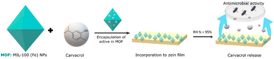 Representation of the encapsulation process of carvacrol in an MOF, in particular MIL-100 (Fe) nanoparticles and their incorporation in polymeric films to control the release of carvacrol and exert its antimicrobial activity.