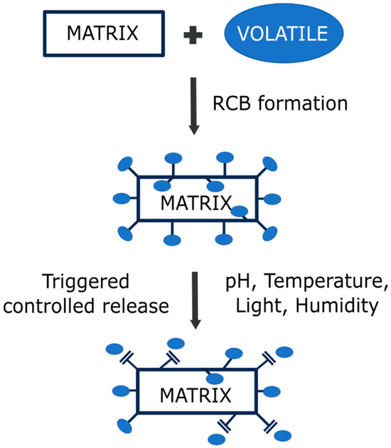 As discussed above, the cleavage of reversible bonds can be triggered by different stimuli, such as humidity, pH, light, and temperature. Changing the pH conditions is the most common method of triggering the release of volatiles. Most volatiles used in active packaging applications are aldehydes, ketones, esters, and alcohols, which are stabilized by pH-sensitive imine reversible bonds. Despite the common uses of imines in the design of stimuli-responsive structures for the incorporation and release of volatile molecules, few works have studied their volatile release mechanisms [118]. Figure 3 explains the volatile release mechanism concept.