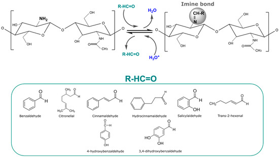 The principal chitosan imine stimuli-responsive structures have been developed as films. These films can be prepared by casting directly from a solution with both chitosan and the volatile, or by previously preparing a chitosan film, and then carrying out its functionalization through a reaction of the volatile with the already-casted chitosan film [126]. Most works design stimuli-response chitosan films wherein the aldehyde release is activated by acidic pH conditions in aqueous solutions, subjecting the film to direct contact with the triggering factor [45,51,57]. In this sense, plenty of antimicrobial aldehydes such as benzaldehyde, citronellal, cinnamaldehyde, hydrocinnamaldehyde, salicylaldehyde, 4-hydroxybenzaldehyde, 3,4-dihydroxybenzaldehyde, and trans-2-hexenal have been immobilized on chitosan films. Figure 4 shows the Schiff base or imine bond reaction between the amino group of chitosan with aldehyde molecules with antimicrobial activity, with which it has been already reported that active molecules were kept stable under neutral pH conditions and their release was activated under acidic pH conditions (Figure 4). The acidic conditions favored the cleavage of the imine bond, leading to the release of the aldehyde. The distribution of the imine bonds all along the film allowed for a fast release until the maximum was achieved, and then over time, a slow decrease in the release rate was observed. Post-modification of the films via imine bonds was found to be a great way to immobilize aldehyde in order to accomplish a fast release under acidic conditions with a more stable phase until the maxim is achieved. This is because the post-modification of the films leads to a surface modification without the need for a complete overture of the polymer.