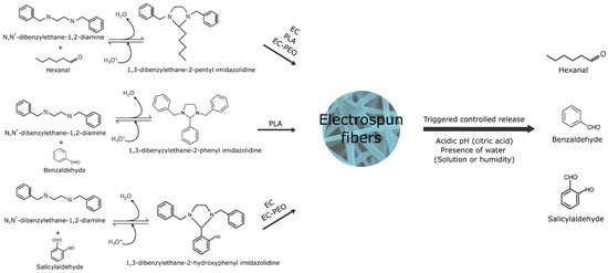 Formation of imidazolidine precursors, their encapsulation as fibers with ethylcellulose-poly(ethylene oxide) (EC-PEO), ethylcellulose (EC), and poly(lactic) acid (PLA) by electrospinning, and the release of benzaldehyde, hexanal, and salicylaldehyde under acidic pH conditions.