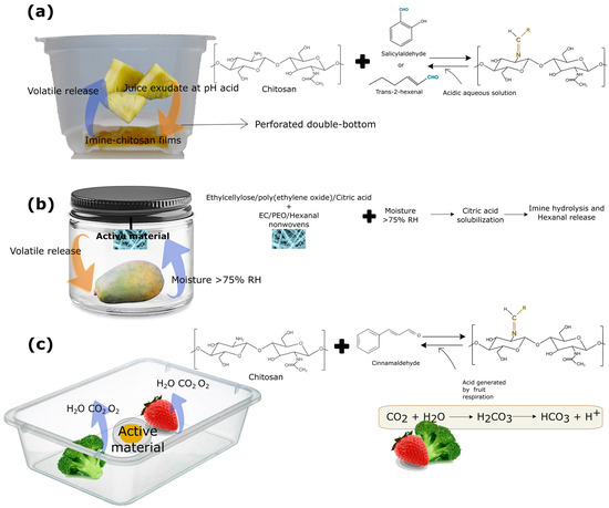 Another study increased the shelf life of papaya through the release of hexanal. In this work, the volatile was anchored to a precursor N,N’-dibenzylethylethane-1,2-diamine to form a stable imidazolidine, which was then incorporated in electrospun ethylcellulose/poly(ethylene oxide) fibers with citric acid. This material was placed in a jar with a papaya following the scheme shown in Figure 6b. Upon contact with the moisture generated by the product during storage, the citric acid incorporated in the fibers was solubilized, resulting in the hydrolysis of the imine bond and, subsequently, the release of hexanal, delaying product ripening for 4 days [134]. In addition, Liu et al. [135] demonstrated the high potential of chitosan modified particles with cinnamaldehyde to extend the shelf life of broccoli and strawberries. The release was triggered by the high transpiration rate of these fruits and vegetables, as shown in Figure 6c. In this case, no acidic stimulus was incorporated externally, and the authors reported that the release was promoted by the resulting package headspace from the high-rate respiration of the food together with the generated moisture.