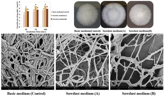 3.1. Effect of Sawdust Addition on Mycelial Growth Rate and Morphological Characteristics of H. marmoreus