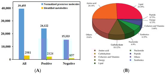 Classification of the identified metabolomics data of H. marmoreus mycelia. (A) Histogram of normalized precursor molecules and metabolites. (B) Classification pie chart of 551 metabolites for secondary identification.