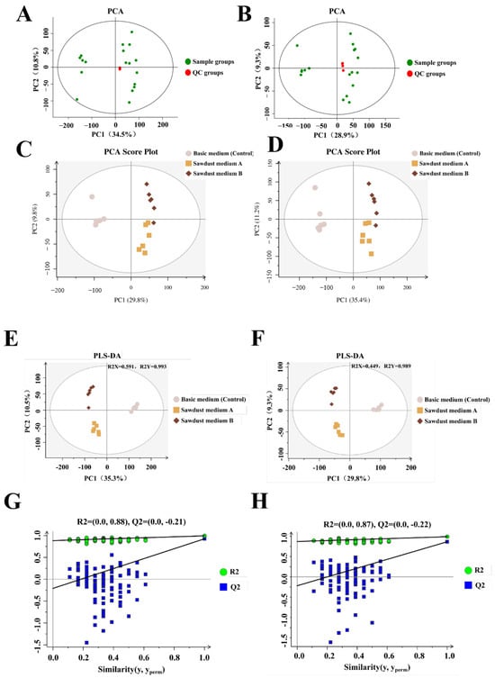 Multivariate analysis and permutation test of LC-MS-based metabolomics data of H. marmoreus mycelia. (A,B) Principal component analysis (PCA) of H. marmoreus metabolome of sample groups and quality control (QC) group in the positive and negative ion modes. (C,D) Principal component analysis (PCA) of H. marmoreus metabolome of three sample groups in positive and negative ion modes. (E,F) Partial least squares-discriminate analysis (PLS-DA) in the positive and negative ion modes, respectively. (G,H) Permutation test results of the PLS-DA mode in the positive and negative ion modes, respectively.