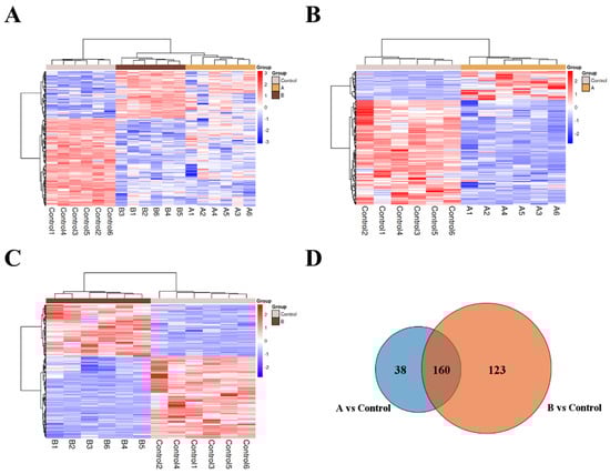Multiple comparisons showed that 160 DAMs were detected in both A vs. Control and B vs. Control, among which the lipids and amino acids accounted for the majority, making up 28.13% and 20.63% of the 160 DAMs, respectively (Figure 4D and Table S4). Additionally, 123 DAMs were unique in group B vs. Control, and 38 DAMs were unique in group A vs. Control.