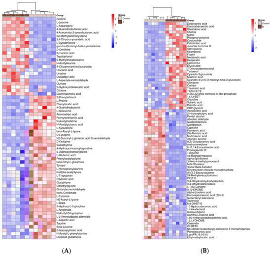 Differentially accumulated amino acids (DAAs) and differentially accumulated lipids (DALs) in B vs. Control. (A) Heatmap of the DAAs. (B) Heatmap of the DALs.