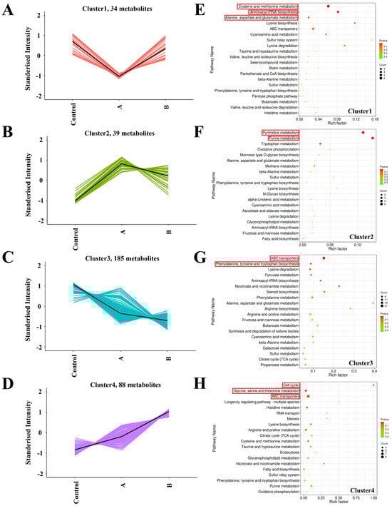 The K-means clustering and KEGG enrichment analyses are based on differentially accumulated metabolites (DAMs) within each cluster from samples A (5 g of sawdust) and B (15 g of sawdust). (A–D) The K-means clustering groups of the DAMs expression profiles of H. marmoreus mycelia cultured under three treatments. The y-axis represents the standardized amount of each metabolite, and the x-axis represents the different treatment groups. (E–H) Top 20 enriched KEGG pathways of the DAMs gathered in the corresponding cluster. The color intensity (green to red) is proportional to the enrichment significance, and the circle size indicates the number of enriched metabolites. The pathways with significant differences were highlighted in a red box (p < 0.05).