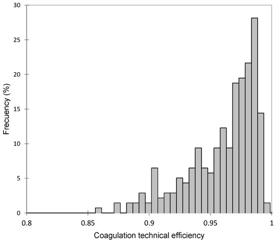 Previous studies have used deterministic parametric methods to assess process efficiency, including coagulation [18,19]. However, the introduction of stochastic frontier analysis (SFA) has led to a more nuanced approach [20]. SFA separates deterministic efficiency from stochastic noise, providing deeper insights into process inefficiencies by considering the inherent variability in production. This approach, therefore, offers a more comprehensive understanding of efficiency.