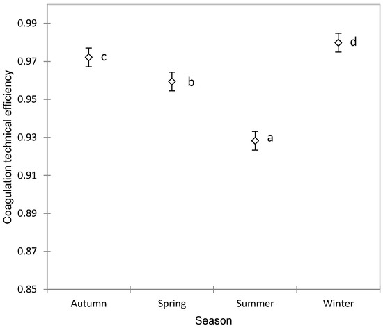 Association between the season and coagulation technical efficiency in Manchega sheep using ANOVA (mean ± standard error). Means without a common superscript (a–d) are statistically different (Student–Newman–Keuls, SNK p < 0.05).